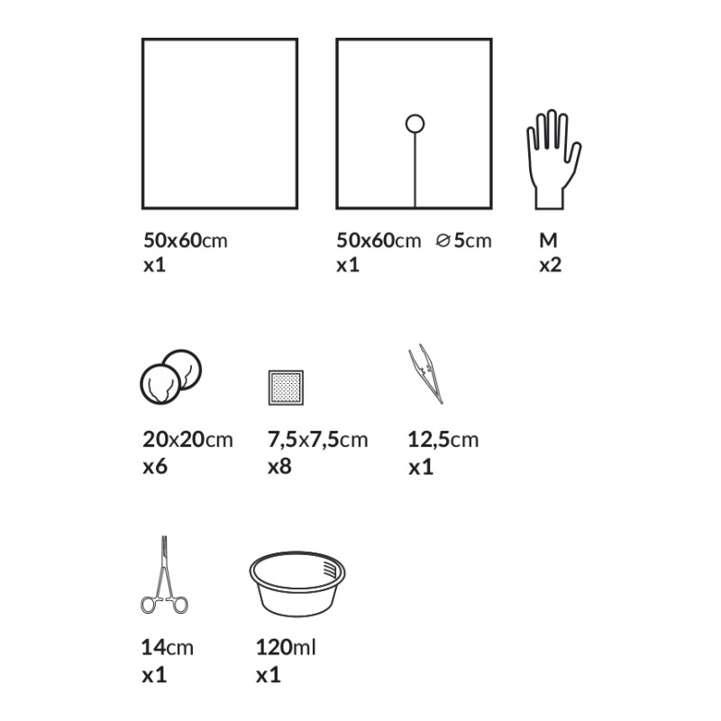 • 1 szt. serweta chirurgiczna 2-warstwowa, z centralnym otworem i przecięciem 50cm x 60cm; otwór: śr. 5cm; włóknina polipropylenowa + folia polietylenowa nieprzemakalna; kolor niebieski