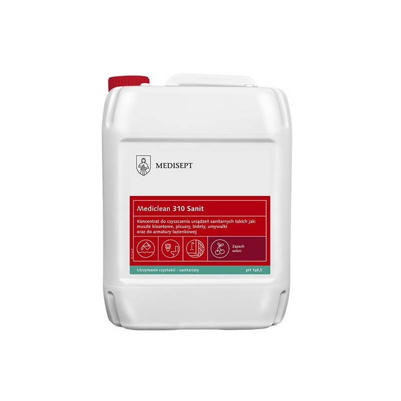 Mediclean 310 Sanit 5L Wiśnia to koncentrat do czyszczenia urządzeń sanitarnych takich jak: muszle klozetowe, pisuary, bidety, umywalki oraz armatury łazienkowej. Do utrzymania czystości wszystkich powierzchni i przedmiotów sanitarnych odpornych na działanie kwasów. Skutecznie usuwa kamień, rdzę, pozostałości mydła oraz tłuste zabrudzenia. Zalecany do mycia umywalek, muszli klozetowych, pisuarów, kabin prysznicowych i armatury łazienkowej, a także elementów ze stali nierdzewnej i aluminium. Zapewnia doskonałą czystość, pozostawiając przyjemny zapach.