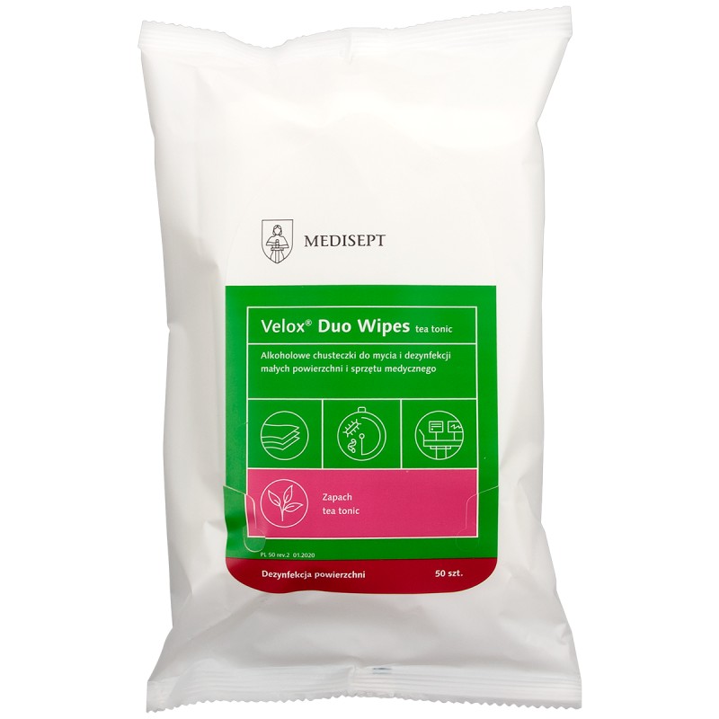 Velox® Duo Wipes to chusteczki alkoholowe do mycia i szybkiej dezynfekcji małych powierzchni medycznych. Zalecane do dezynfekcji małych powierzchni sprzętu medycznego: łóżek i foteli zabiegowych, aparatury medycznej i nieinwazyjnego sprzętu medycznego. Zalecane do dezynfekcji końcówek stomatologicznych przed procesem sterylizacji oraz łyżek protetycznych i wycisków silikonowych.