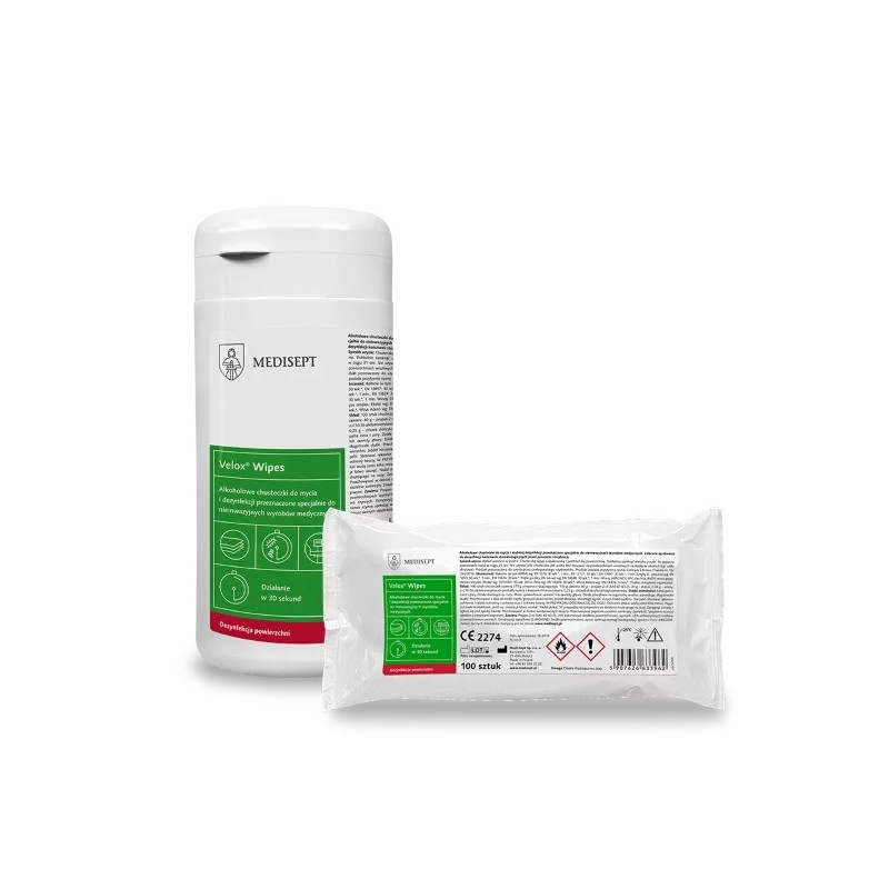 Velox® Wipes to chusteczki alkoholowe do mycia i szybkiej dezynfekcji małych powierzchni medycznych. Zalecane do dezynfekcji małych powierzchni sprzętu medycznego: łóżek i foteli zabiegowych, aparatury medycznej i nieinwazyjnego sprzętu medycznego. Zalecane do dezynfekcji końcówek stomatologicznych przed procesem sterylizacji oraz łyżek protetycznych i wycisków silikonowych.