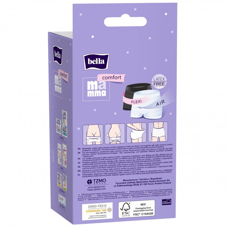 Majtki Bella Mamma Comfort to bielizna wielokrotnego użytku przeznaczona do podtrzymywania higienicznych podkładów poporodowych. Majtki poporodowe Bella Mamma Comfort to produkt estetyczny i starannie wykonany. Doskonale dopasowują się do ciała i zapewniają maksymalny komfort noszenia. Są elastyczne, miękkie i przyjemne w dotyku. Nie uciskają, ale jednocześnie skutecznie utrzymują podkład poporodowy na swoim miejscu. Majtki stanowią niezbędny element wyprawki do szpitala dla każdej mamy.