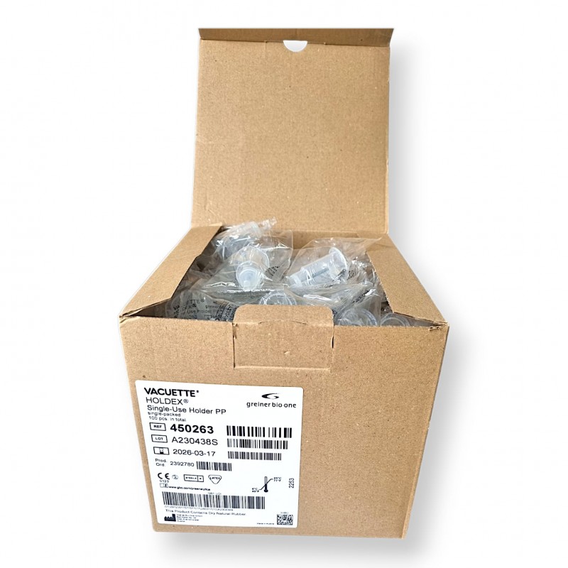 Jednorazowy uchwyt HOLDEX® wykonany z polipropylenu, przeznaczony jest do stosowania w procedurach pobierania krwi w połączeniu z przyrządami do pobierania krwi z żeńskim złączem typu Luer. Uchwyt umożliwia połączenie systemu próżniowego (próbówki z próżnią) z igłą iniekcyjną, do pobierania (standardowa igła z jednym ostrzem, nie próżniowa).