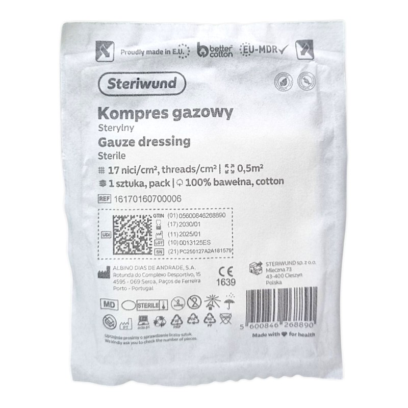 Kompres gazowy Steriwund wykonany w 100% z gazy bawełnianej, bielony metodą bez chlorową gwarantująca wysoki poziom czystości chemicznej. Kompres stosowany jest do ogólnego opatrywania ran. Stanowi najpopularniejszy produkt przy zmianie opatrunku.