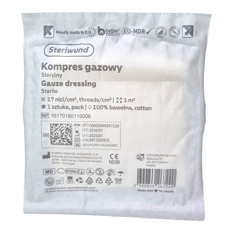 Kompres gazowy Steriwund wykonany w 100% z gazy bawełnianej, bielony metodą bez chlorową gwarantująca wysoki poziom czystości chemicznej. Kompres stosowany jest do ogólnego opatrywania ran. Stanowi najpopularniejszy produkt przy zmianie opatrunku.