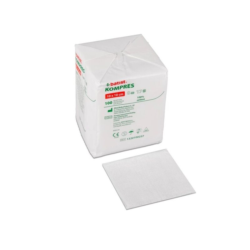 Kompresy gazowe wyprodukowane z 13-nitkowej 100% bawełny bielonej bezchlorowo. Złożone z 8 warstw z brzegami podwiniętymi lub podwiniętymi typu ES – dzięki temu eliminowane jest ryzyko wysuwania się luźnych nitek. Doskonale sprawdzi się w gabinetach ambulatoryjnych, salach operacyjnych, a także higienicznych i kosmetycznych.