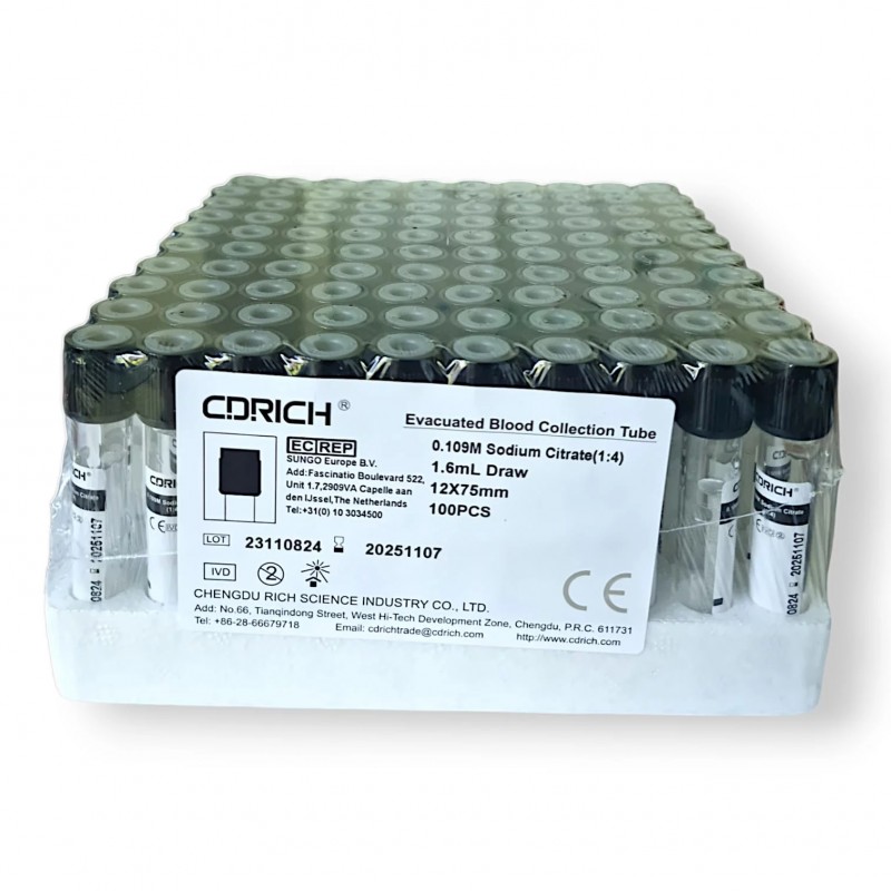 | szklana | 12x75 mm | 1,6 ml | bezpieczny/czarny | papierowa | Cytrynian Sodu | 100/1000 |