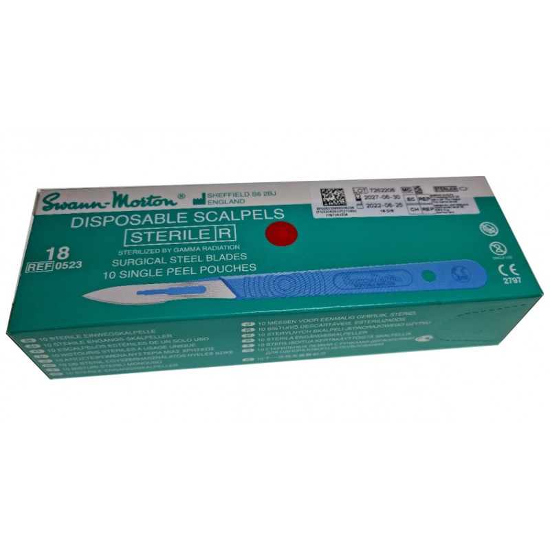 Ostrze chirurgiczne nr. 18 ze stali nierdzewnej naostrzone wzdłuż jego najdłuższej krawędzi, dodatkowo wyposażone w mocną, szpiczastą końcówkę.