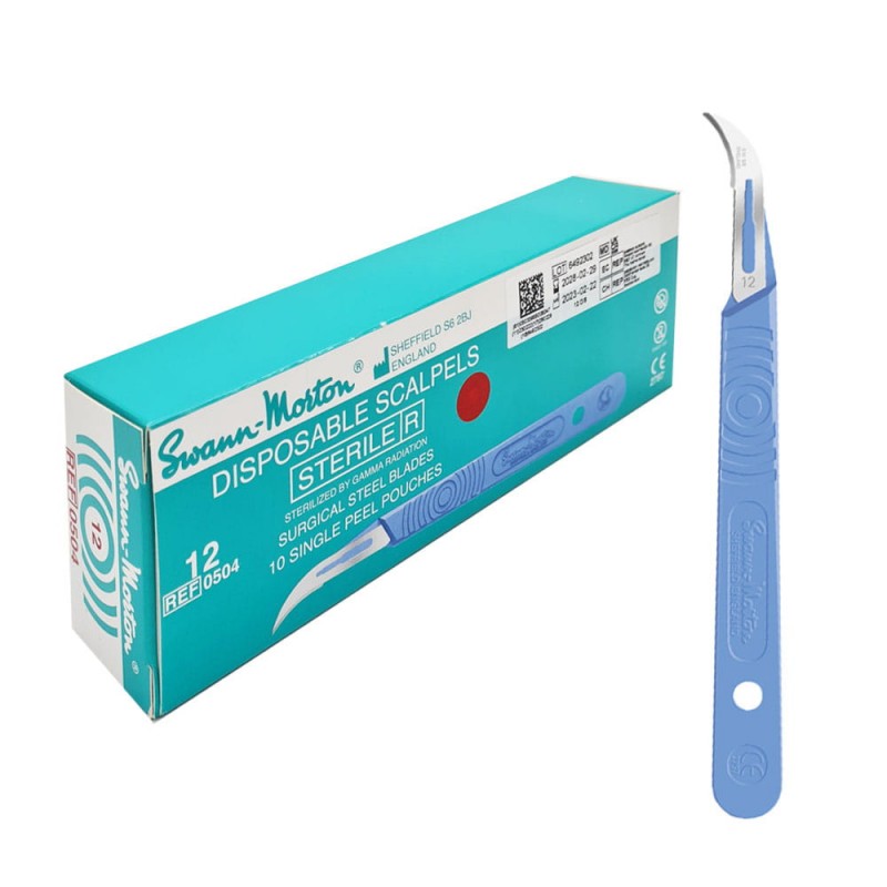 Ostrze chirurgiczne nr, 12 ze stali nierdzewnej naostrzone wzdłuż jego najdłuższej krawędzi, dodatkowo wyposażone w mocną, szpiczastą końcówkę.