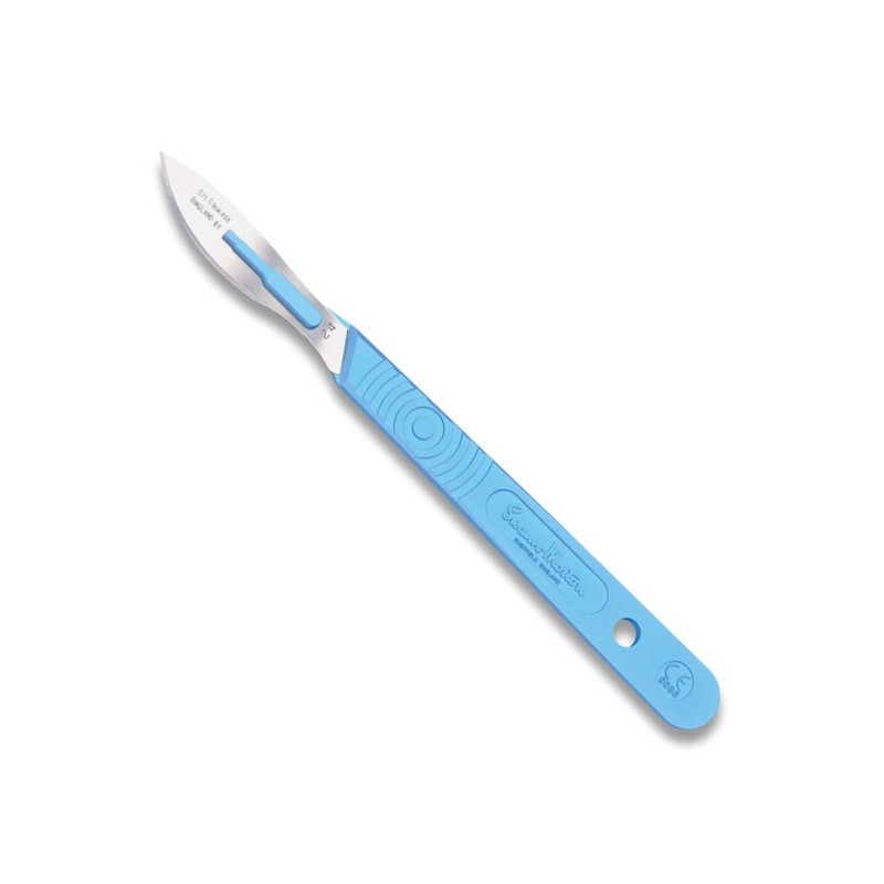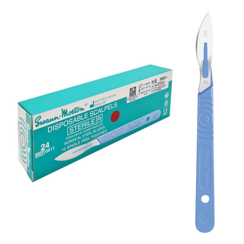 Ostrze chirurgiczne nr. 24 ze stali nierdzewnej naostrzone wzdłuż jego najdłuższej krawędzi, dodatkowo wyposażone w mocną, szpiczastą końcówkę.