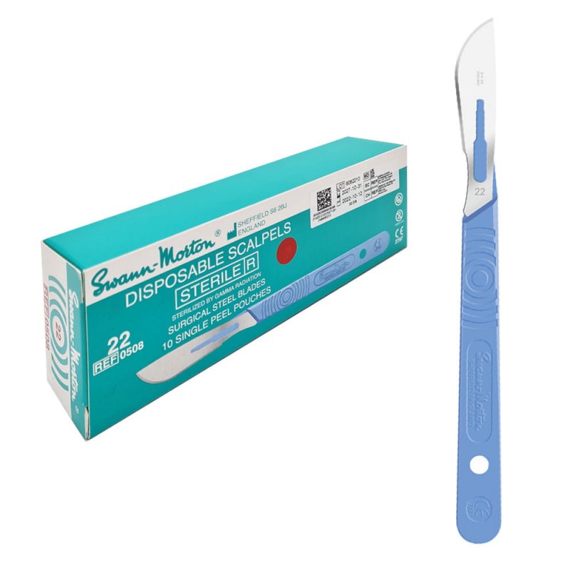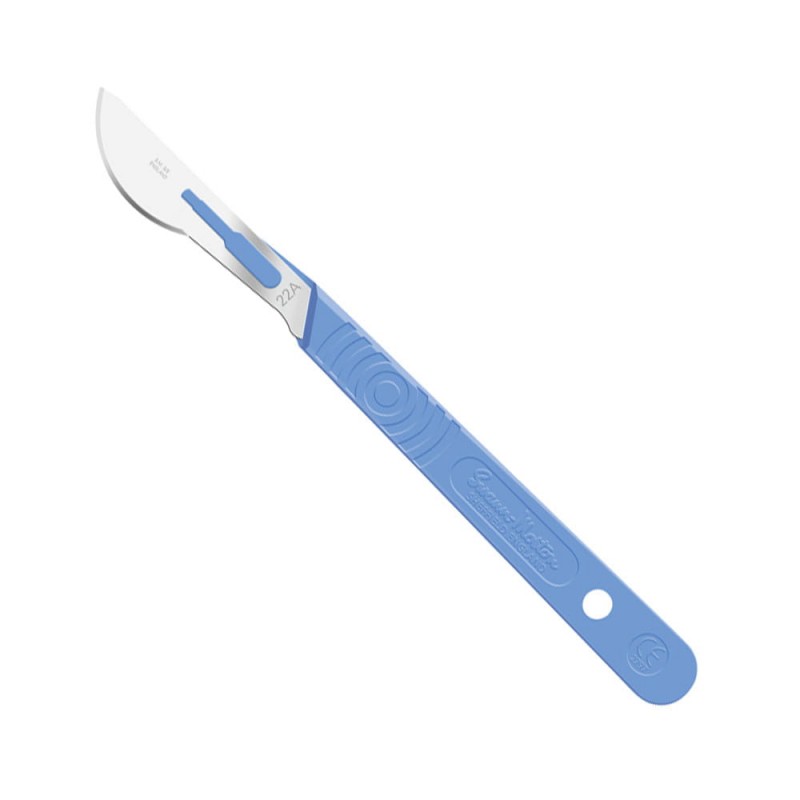 Ostrze chirurgiczne nr. 22 ze stali nierdzewnej naostrzone wzdłuż jego najdłuższej krawędzi, dodatkowo wyposażone w mocną, szpiczastą końcówkę.