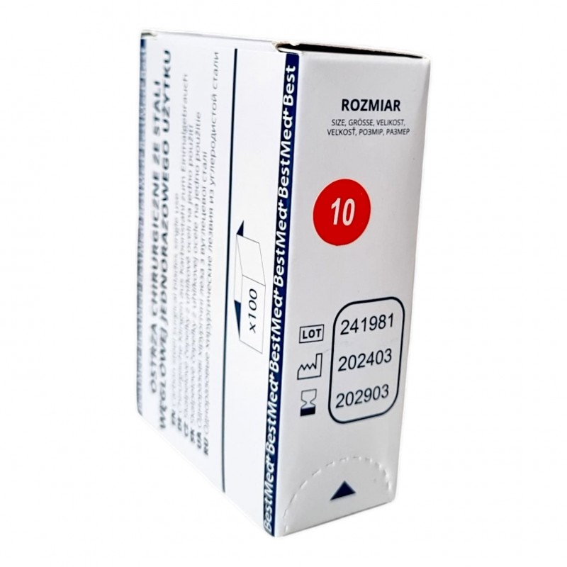 Ostrze chirurgiczne nr. 10 wykonane ze stali węglowej jednorazowego użytku.