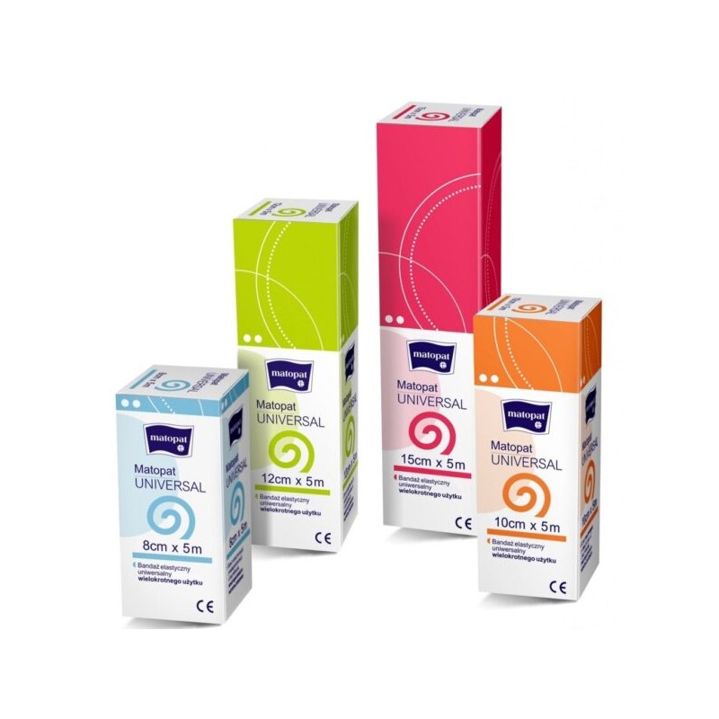 Niejałowy bandaż elastyczny Matopat UNIVERSAL to produkt opatrunkowy o rozciągliwości 120% oraz uniwersalnym zastosowaniu. Wielokrotnego użytku, posiada możliwość prania. Bandaż posiada krepowaną strukturę oraz stałą elastyczność. Do każdego bandaża dołączone są dwie zapinki mocujące.