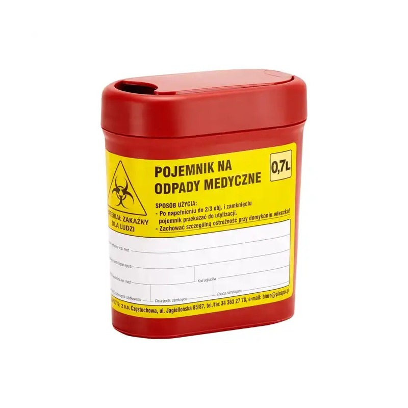 Pojemnik przeznaczony do zbiórki odpadów medycznych w kolorze czerwonym.