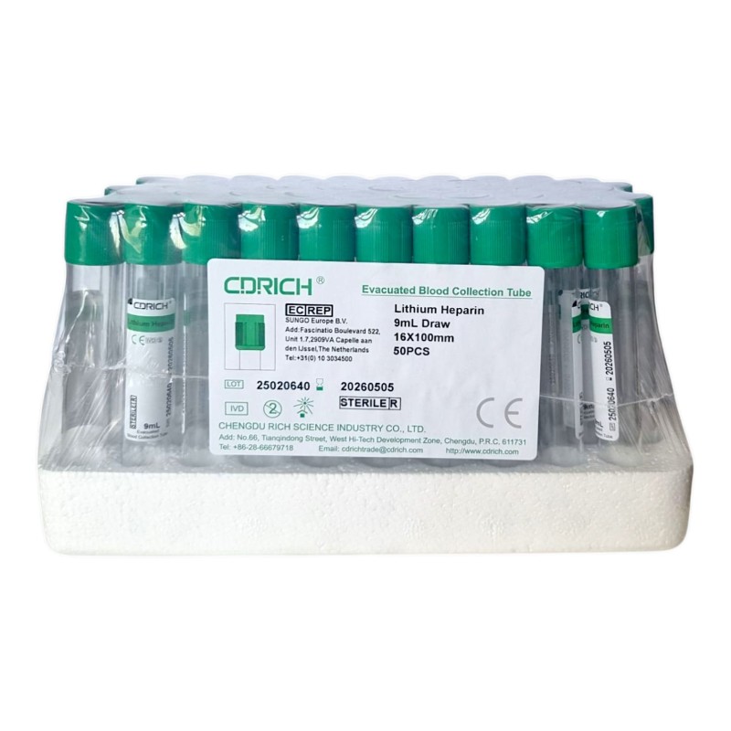 Plastik | 16x100 mm | 9 ml | bezpieczny/zielony | papierowa | Heparyna litowa | 50 szt. |