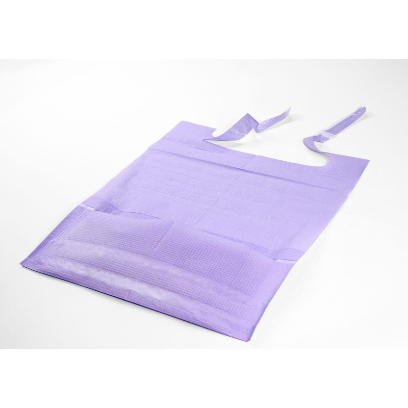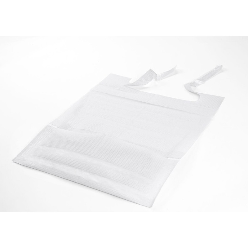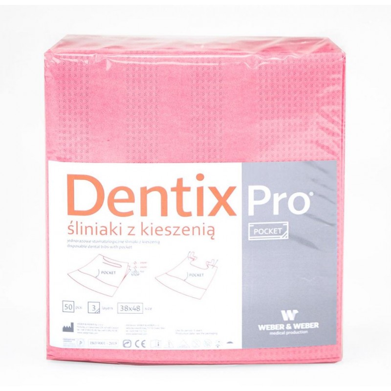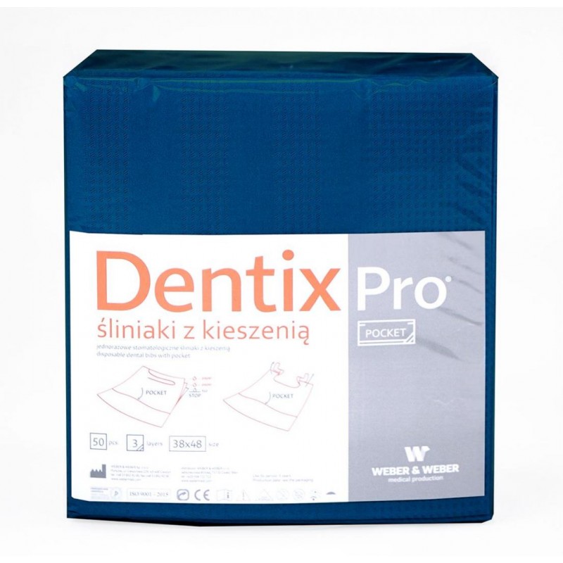 Śliniaki dentystyczne DentixPro z kieszenią zaprojektowane zostały do stosowania w gabinecie stomatologicznym, czy ortodontycznym. Praktyczna kieszeń w dolnej części śliniaka może posłużyć jako miejsce na zużyte podczas leczenia materiały dentystyczne, które mogą zostać zutylizowane wraz ze śliniakiem. Specjalny, głęboki wykrój pod szyją sprawia, że produkt doskonale chroni ramiona pacjenta.