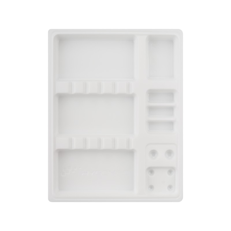 Posiadają specjalne przegródki na wiertła, gumki, narzędzia oraz wgłębienia na wszelakiego rodzaju płyny, materiały, wypełnienia, które po każdym pacjencie zostają od razu wyrzucone wraz z tacką.